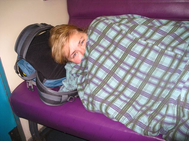Upon arrival at the train station we observed that the Shosholoza ticket offices were closed and wondered where we needed to go in order to get our car and coup assignment. There were a few people sitting and milling about the waiting area, but no one looked like they worked for the train company. Leaving Alex and our pile of bags I went to investigate the train situation, however upon exiting the station to platform 24 I quickly discovered that the train had yet to arrive at the station. I went back to sit with Alex. About 20 minutes later I notice some of the people around us begin to exit the station towards the platform, so I go to check that the train as really arrived. I make my way down the line of identically purple and green painted cars and come upon one of the train stewardesses. I ask her where I find out which car I am in and she points to a lady a little farther down and says she has the manifest. I approach the lady indicated to me and ask her for the same information. She shuffles through her manifest, even though I pointed out my name at the top of the list on the first page, and finally returns to the beginning. “Car 5, Sleep K”. I thank her and walk back inside the station to collect Alex and our bags.